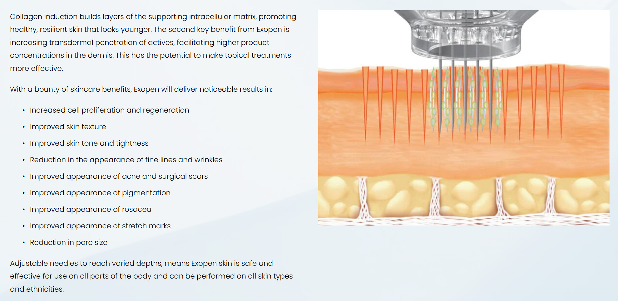 Its application to the skin has been shown to increase transdermal product delivery by several orders of magnitude. Moreover, electroporation, used alone or in combination with skin microneedling expands the range of products which can be delivered trans-dermally. The main advantage of electroporation is that it is a totally painless treatment not causing any kind of trauma to the skin as it does not require needles.
