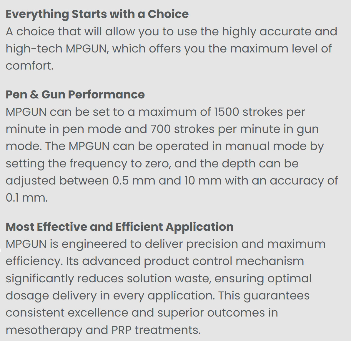The AI technology integrated into MPGUN has been implemented to enhance the PID control algorithm's performance and further optimize the injection process. Artificial intelligence continuously monitors and analyzes factors such as fluid pressure, injection speed, and tissue responses in real-time. Based on these analyses, optimized control signals are generated at every stage of the injection procedure, significantly improving precision and efficiency.